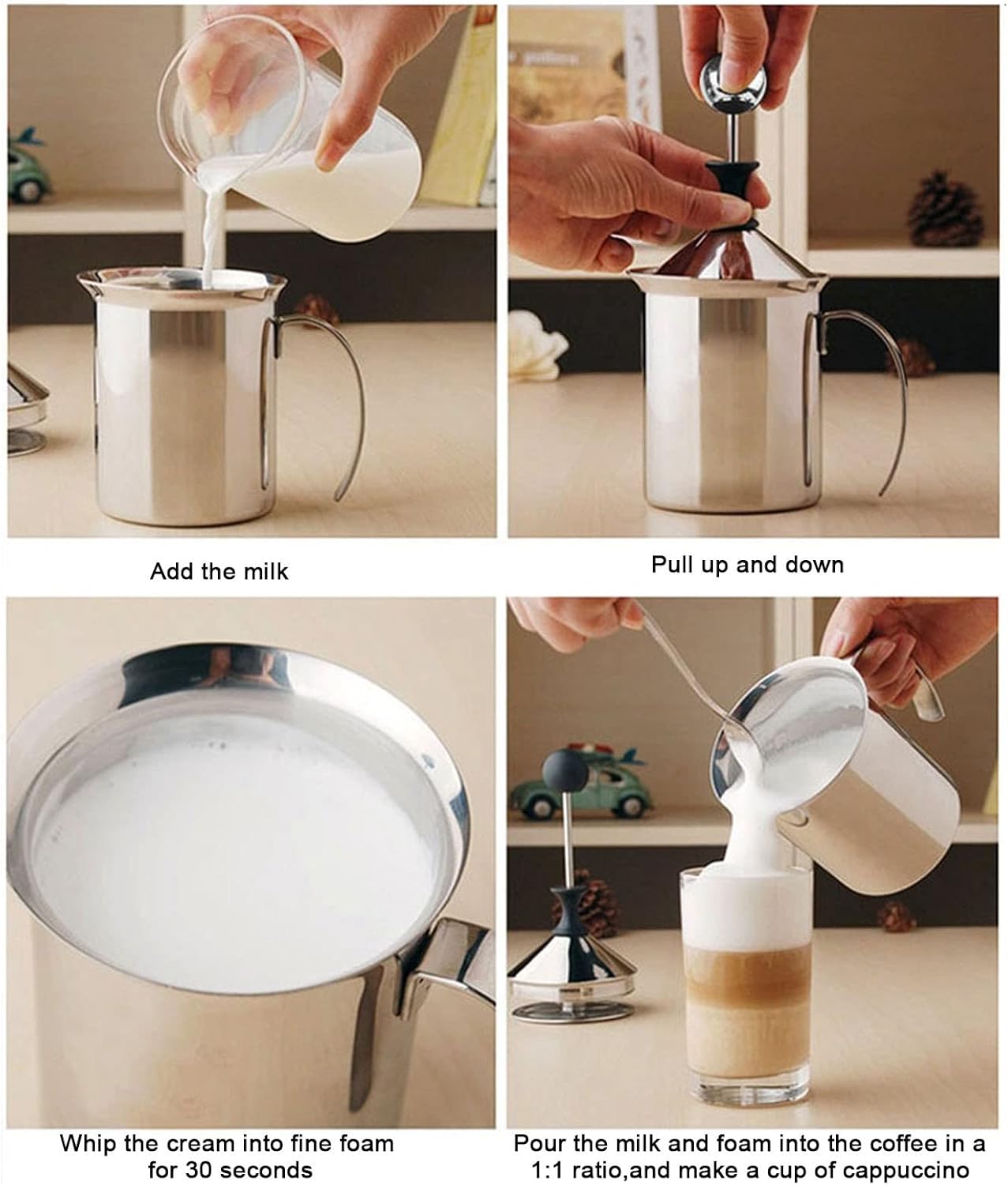 Manual Milk Frother, Double Layer Stainless Steel Hand Pump Milk Foamer for Cappuccino, Latte, and Coffee Foam, 800ML, Heat-Resistant, Easy to Clean, Compact Design for Home, Office, Travel
